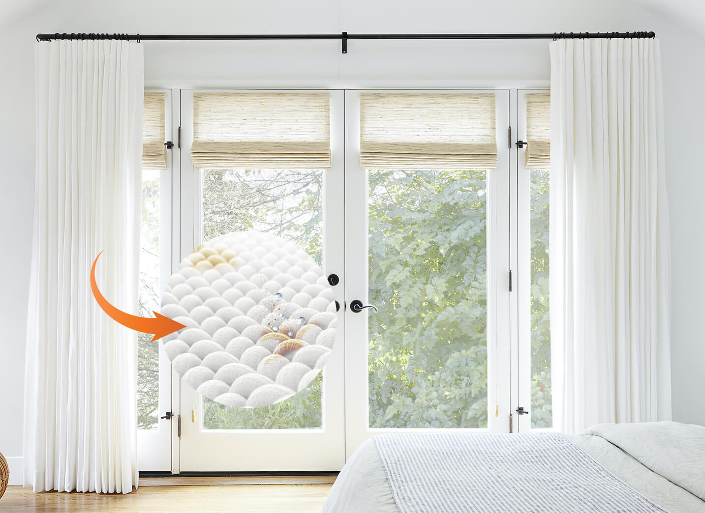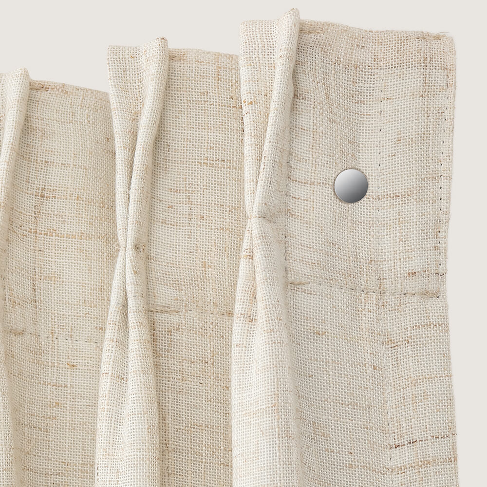 The button design keeps curtain edges from fipping outward and helps layers stack neaty, creating a graceful, refined drape.